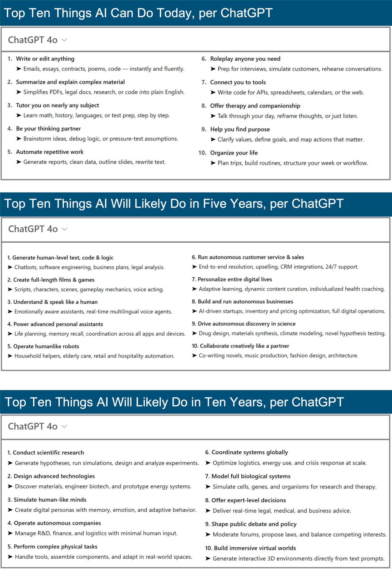 O que a IA pode fazer hoje e no futuro? Hoje, a IA escreve, ensina, resume, automatiza tarefas e oferece suporte emocional. Em 5 anos, criará jogos, gerenciará negócios e atuará como assistente pessoal. Em 10 anos, poderá liderar pesquisas científicas, operar empresas e simular mentes humanas.